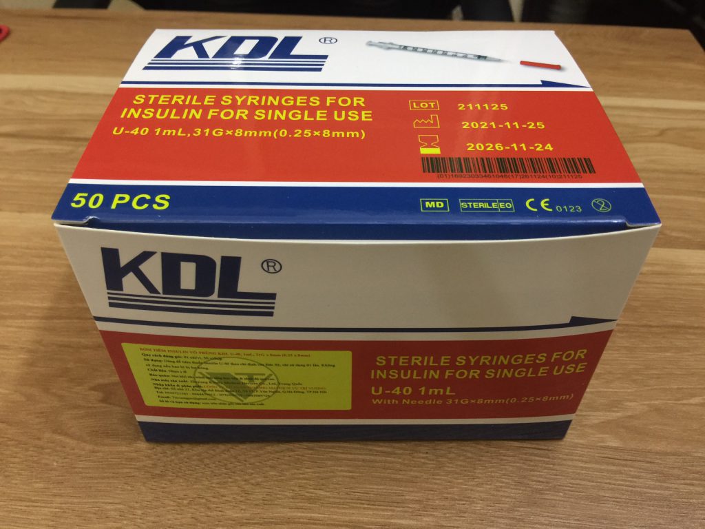 – Sterile Syringe for Insulin for Single Use U-100, 1 ml 31G x 8mm : bơm tiêm Insulin có thể tích 0.3 ml dùng để tiêm thuốc Insulin có nồng độ 100UI/ml với kích thước đầu kim là 0.25 x 8 mm.