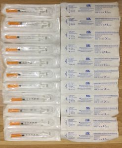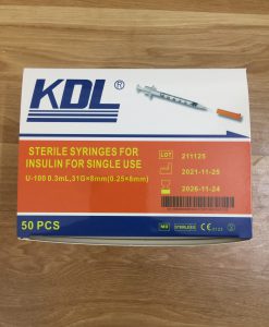 – Bơm tiêm Insulin vô trùng sử dụng một lần U-100, 1 ml 31G x 8mm : bơm tiêm Insulin có thể tích 0.3 ml dùng để tiêm thuốc Insulin có nồng độ 100UI/ml với kích thước đầu kim là 0.25 x 8 mm.